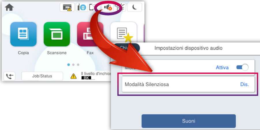 In questi casi, può essere utile attivare la modalità silenziosa. Quando questa funzione è abilitata, il rumore emesso dalle operazioni di stampa/copia/scansione si riduce, tuttavia la velocità di lavoro potrebbe rallentare.